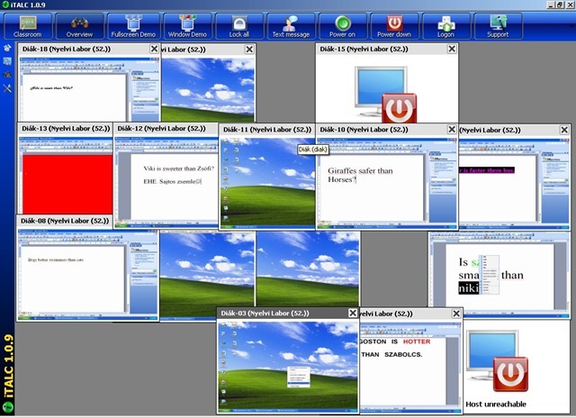 Ez rengeteg pénz, egy ilyen izgalmas, mégis erősen limitált felhasználási lehetőségekkel bíró eszközért. Szerencsére van más megoldás is azoknak a tanároknak a számára, akik szavazóst játszanának egy nyelvórán. Igaz, a rendszer nem hibátlan, de legalább ingyenes. Nem kell más, csak egy számítástechnika terem, pár egyszínű képfájl és a már bemutatott iTalc nevű program, aminek nemrégiben jelent meg egy új verziója (remélhetőleg már teljes értékű Vista és 7-es kompatibilitással).